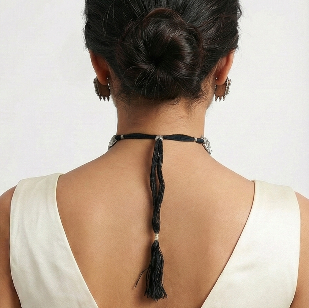 Elevate your ethnic look with this beautifully crafted temple-design oxidised silver choker set, featuring square engraved motifs and a bold handcrafted finish. The intricate artwork adds a touch of tradition, while the antique silver tone makes it a standout accessory for weddings, festivals, pujas, cultural functions, and special events. Paired with matching square earrings, this jewellery set highlights elegance with a strong traditional appeal. Designed to be skin-friendly and lightweight, it offers comfortable wear throughout the day. Perfect for pairing with sarees, lehengas, kurtis, and Indo-ethnic outfits, this set enhances your festive charm and adds a touch of heritage-inspired luxury.