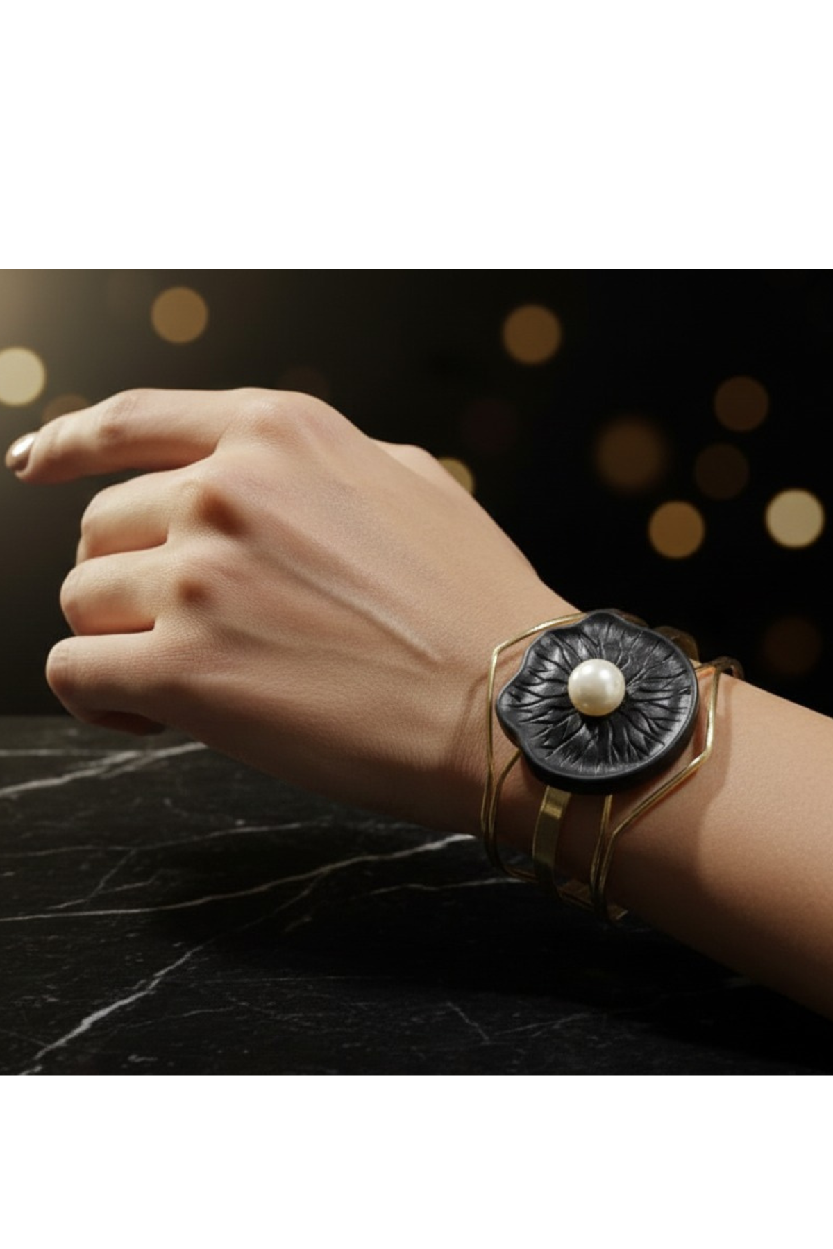 The Aurora Pearl Sculpted Bangle is a bold fusion of modern structure and vintage elegance. Crafted with an open gold-toned framework, this statement bangle features a striking sculpted medallion with detailed floral engraving, finished with a luminous pearl at its center. The contrast between the sleek geometric bands and the ornate focal piece creates a dramatic, artistic look. Designed for confident styling, this bangle is perfect for evening wear, special occasions, or elevating minimalist outfits with a touch of refined luxury.
