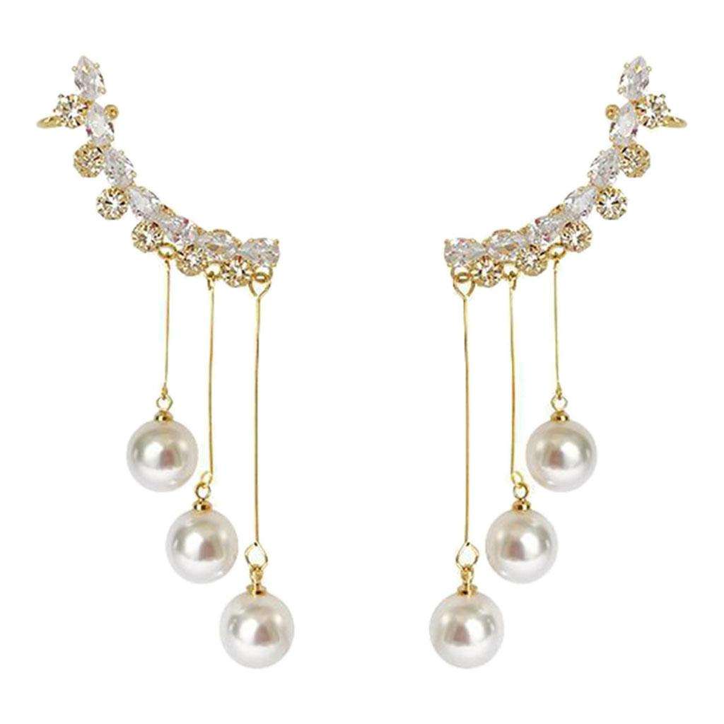 Striking and elegant, the Celestial Crystal Pearl Ear Climber Earrings feature a graceful crescent-shaped crystal design that curves beautifully along the ear. Finished with cascading pearl drops suspended on fine gold-tone chains, these earrings create a soft, luminous movement with every turn. The combination of sparkling crystals and classic pearls delivers a luxurious, statement-making look that feels both modern and romantic. Perfect for weddings, evening events, or elevated formal wear, these earrings are designed to captivate while remaining refined and feminine.