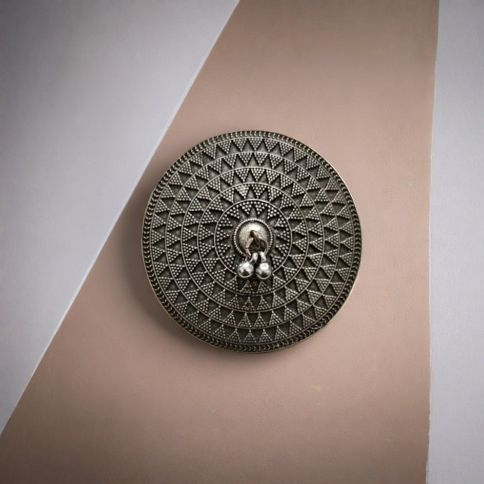 The Chakra Mandala Statement Ring is a striking expression of symmetry, balance, and timeless craftsmanship. Designed with intricate concentric patterns and fine triangular detailing, this oxidized silver ring draws inspiration from sacred geometry and traditional Indian motifs.