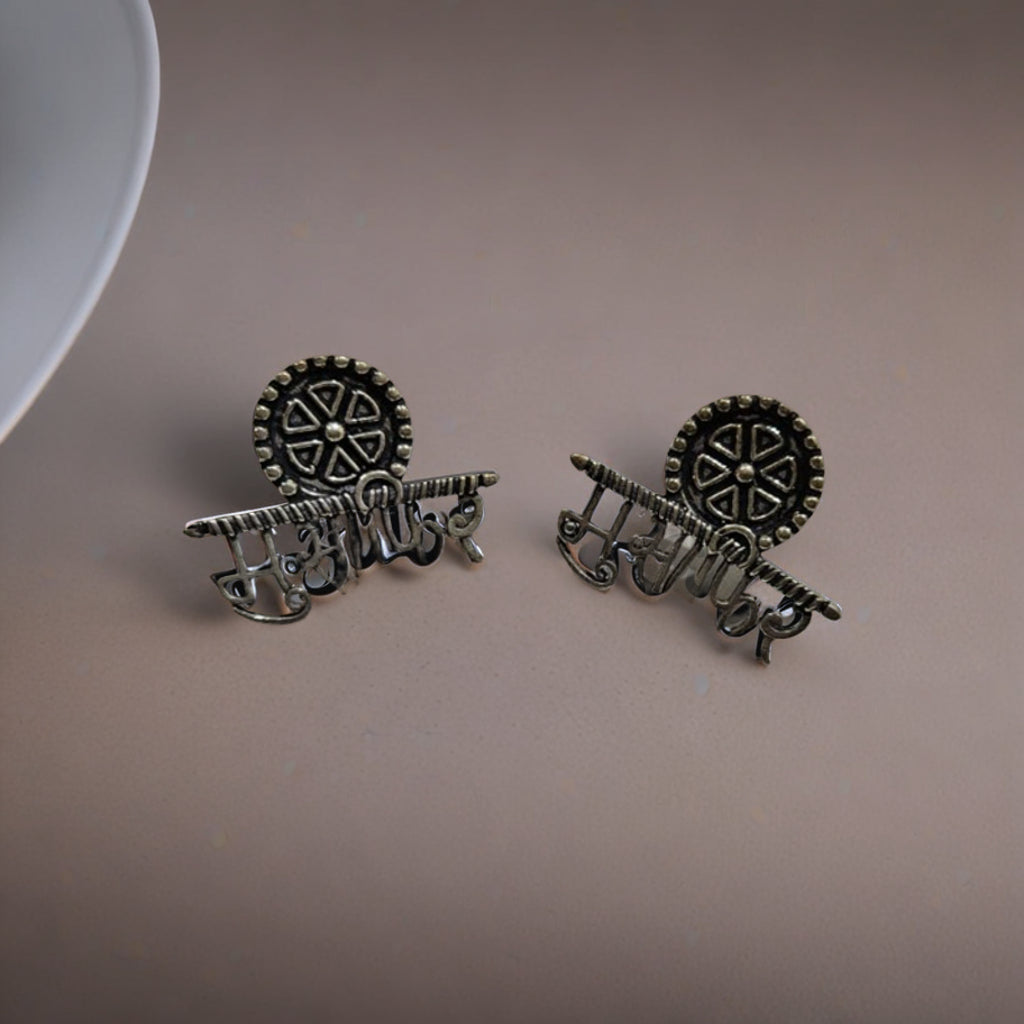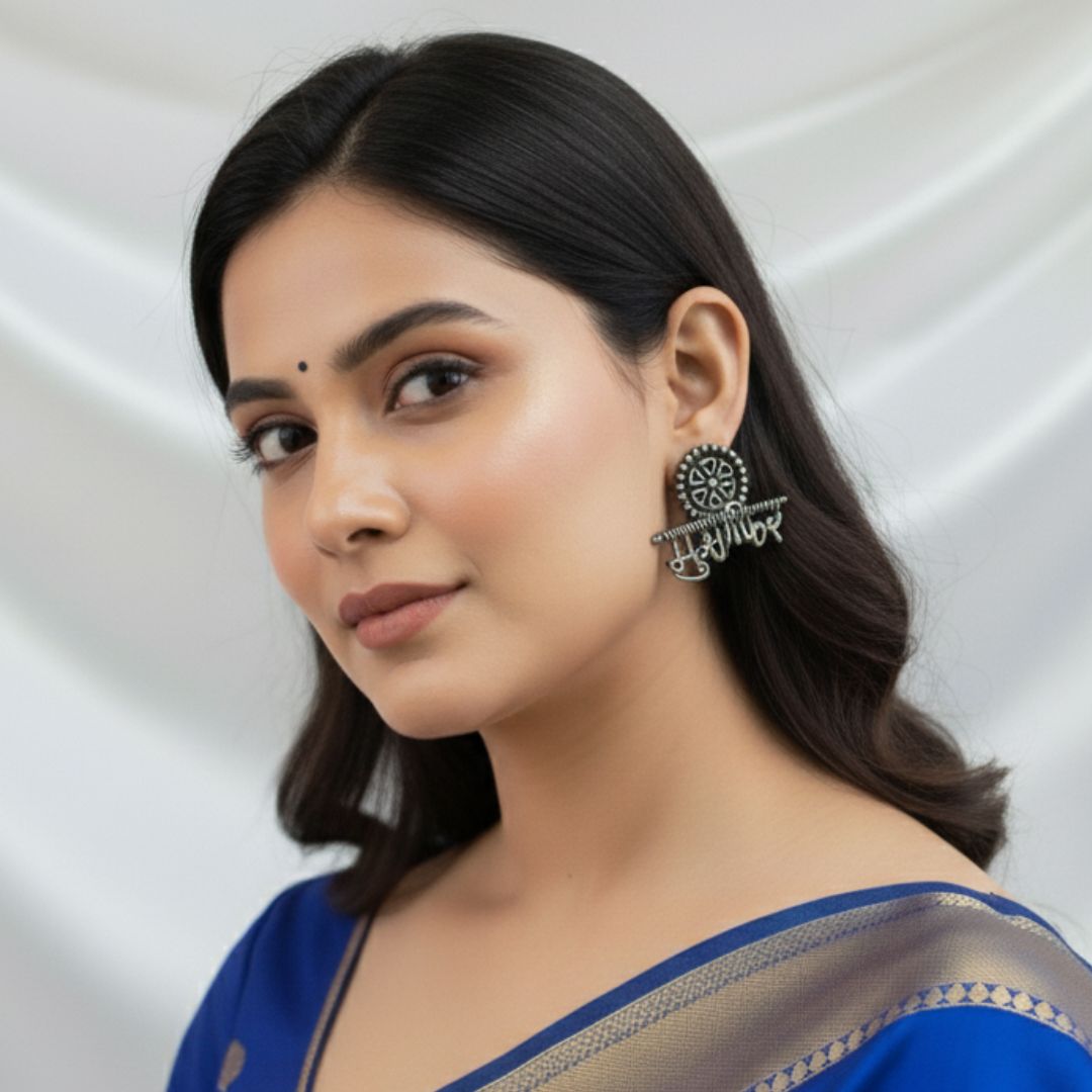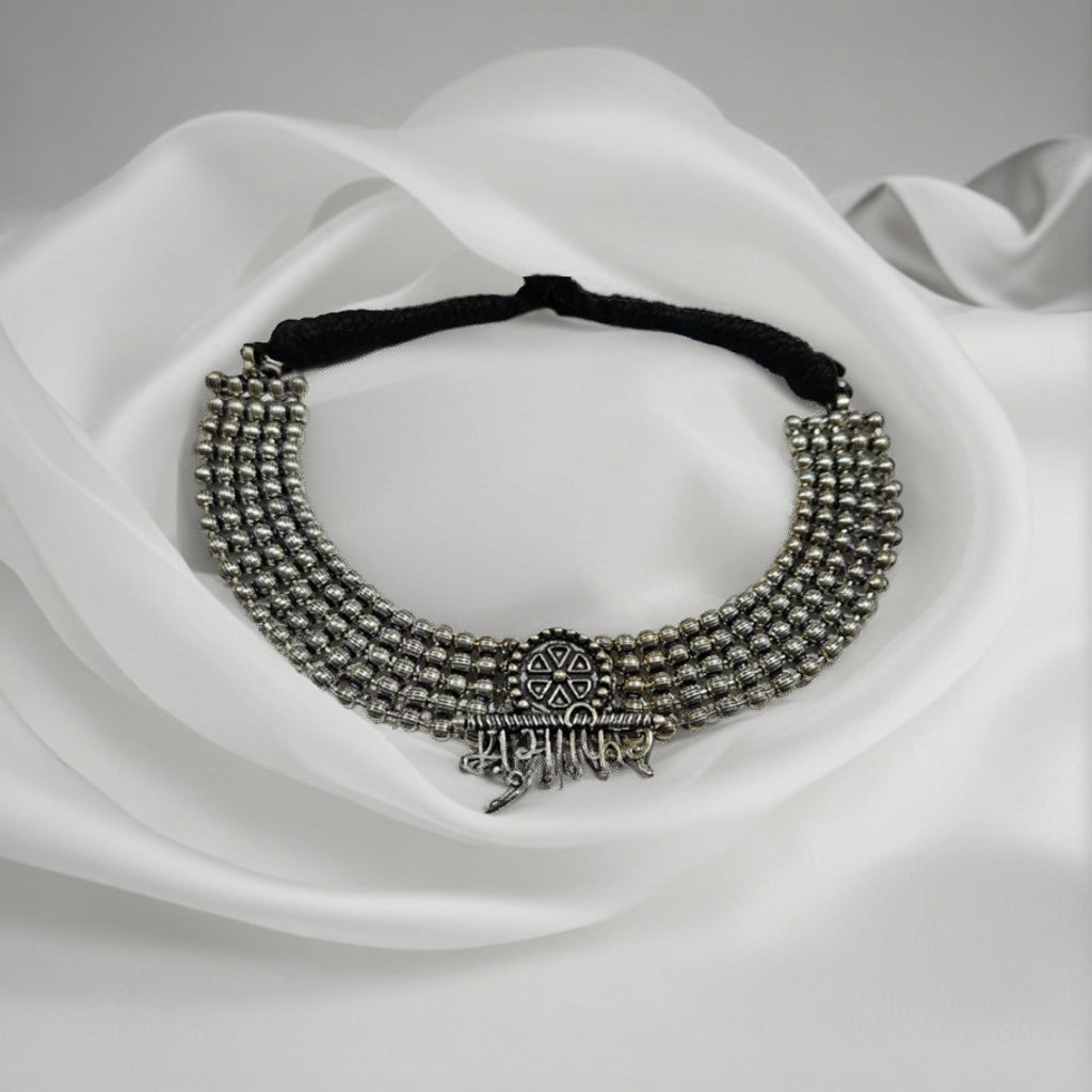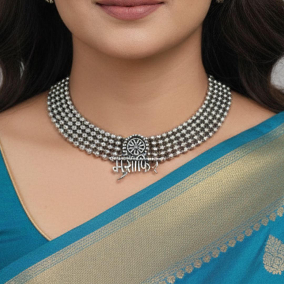 Celebrate heritage and bold elegance with this handcrafted oxidized silver jewellery set inspired by traditional Maharashtrian artistry. The set features a richly textured beaded choker necklace with a striking circular motif and elegant Marathi script charm, symbolizing cultural pride and timeless design.