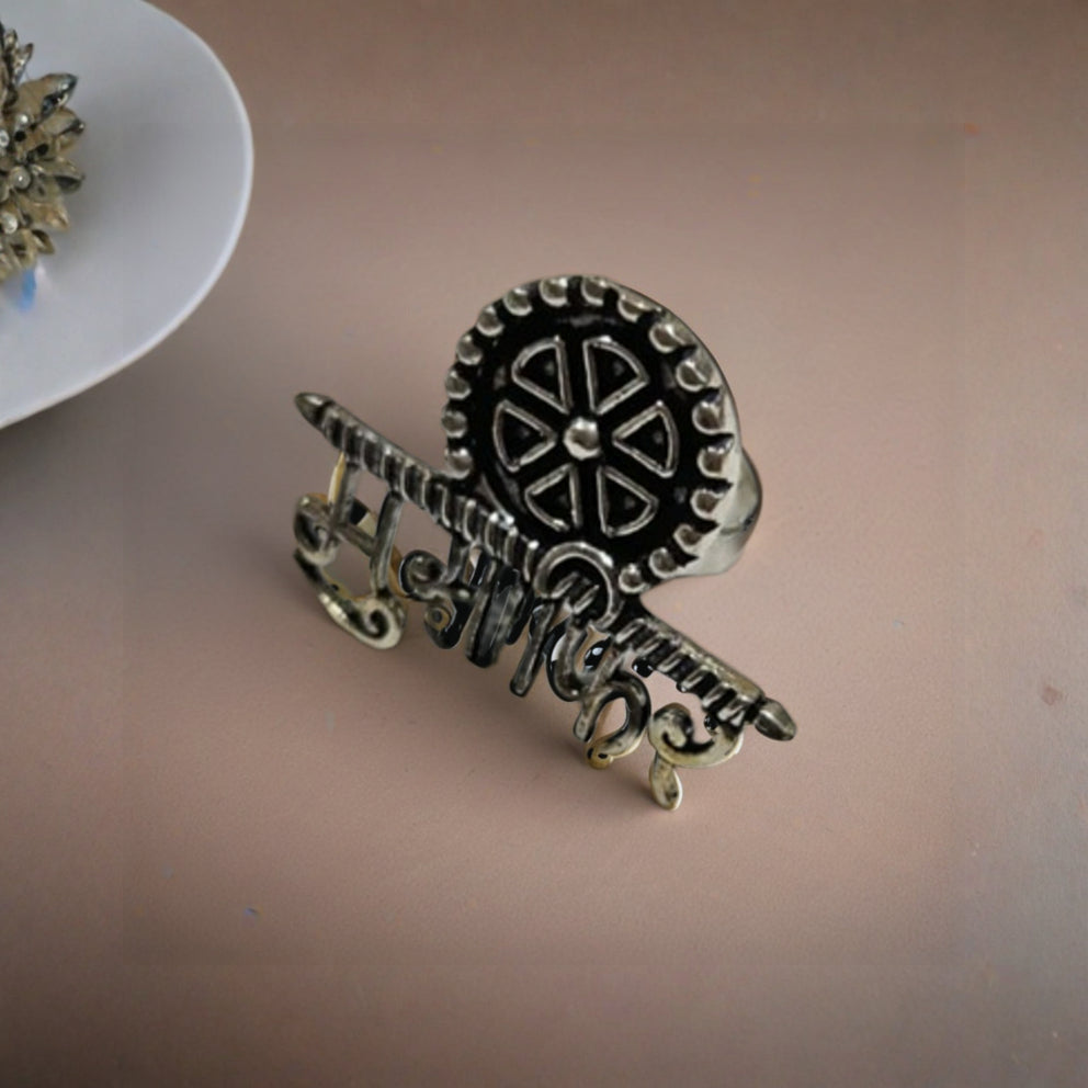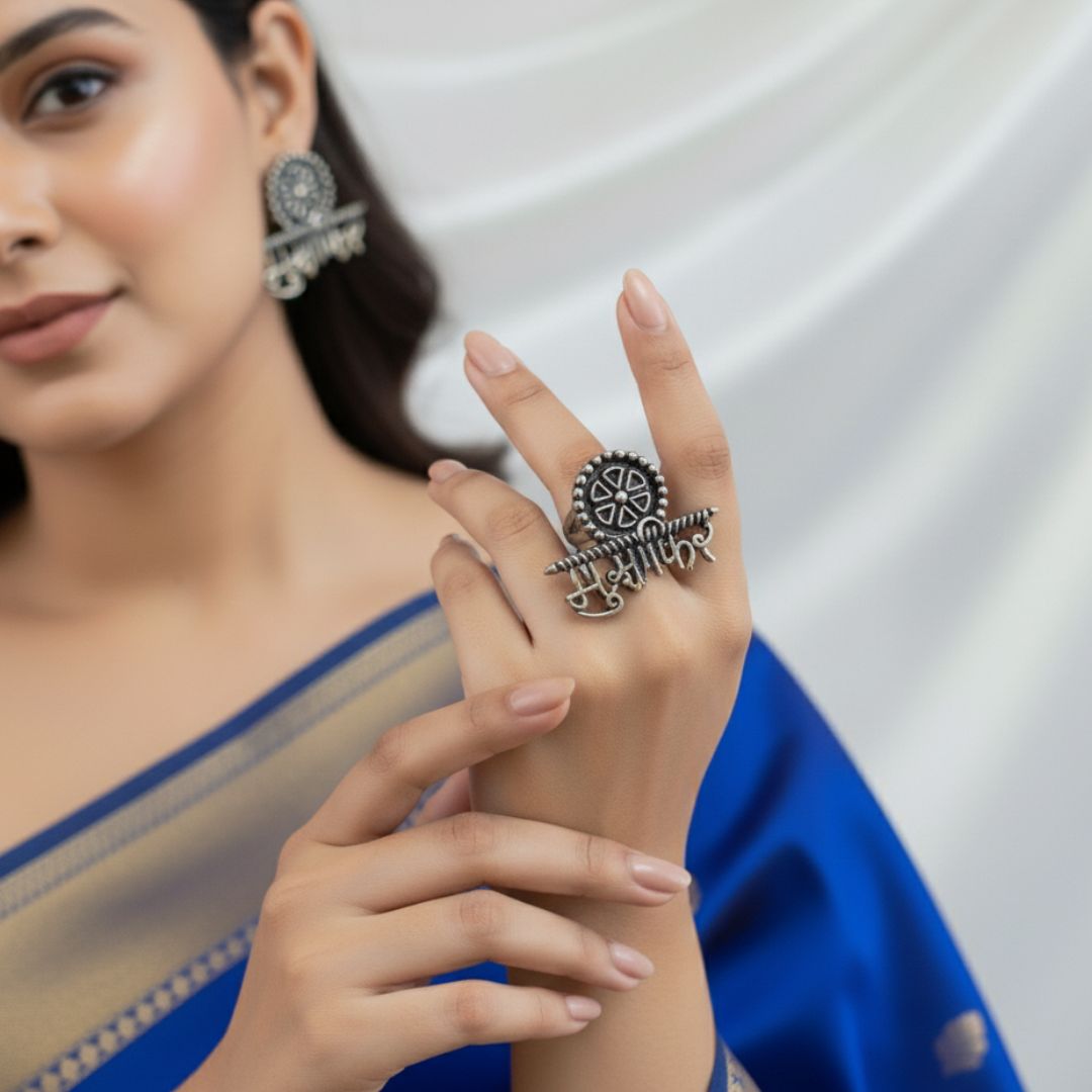 Paired with matching statement earrings and a bold adjustable ring, this set creates a powerful ethnic look that blends tradition with contemporary style. The intricate oxidized finish adds depth and character, making it perfect for festive wear, cultural events, weddings, or saree styling.