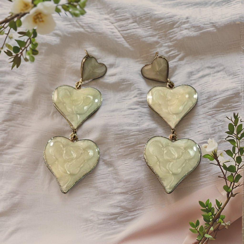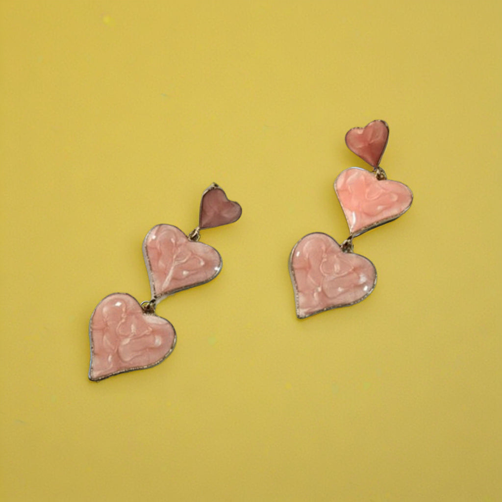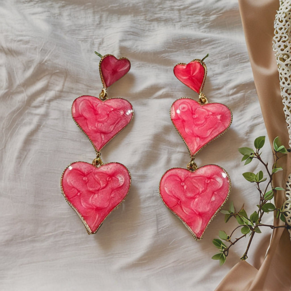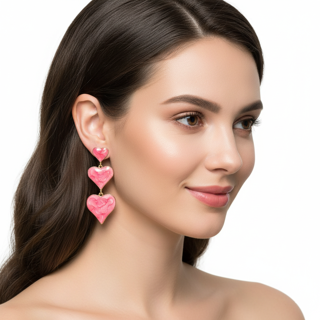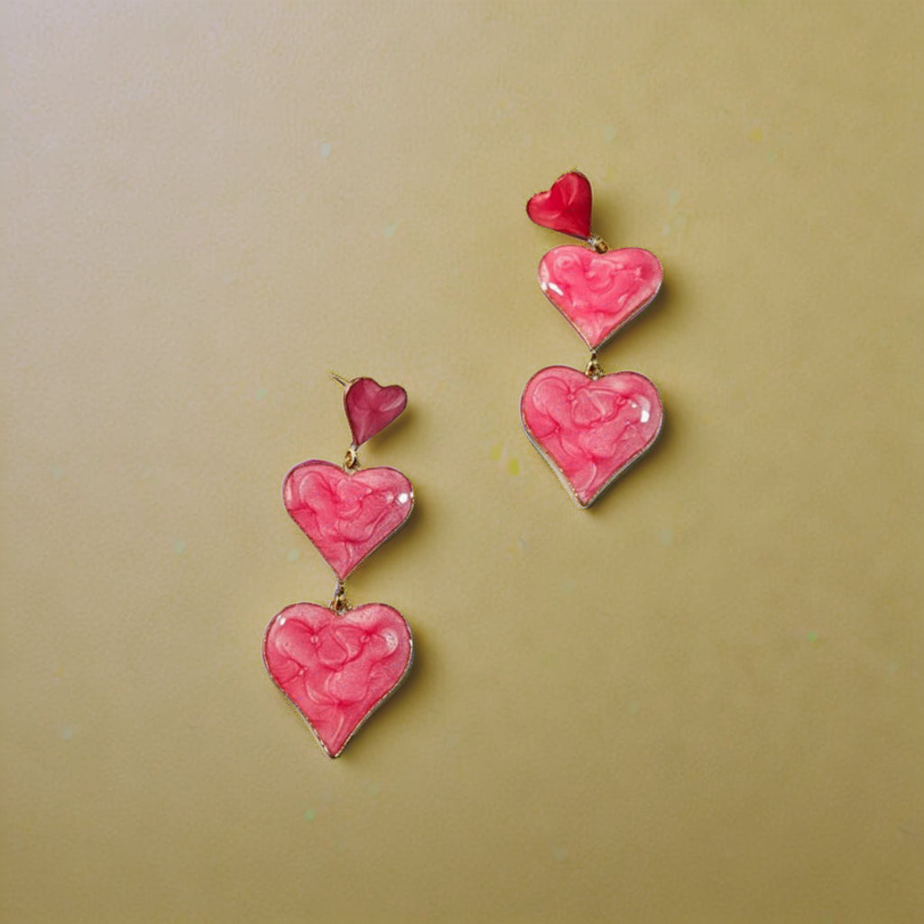 Fall in love with timeless elegance through these beautifully crafted triple-heart drop earrings. Designed with cascading heart motifs, each pair features glossy, marbled enamel hearts framed in a delicate gold-tone outline. The graceful drop silhouette adds movement and charm, making these earrings a perfect blend of romance and modern style. Lightweight and comfortable, they are ideal for both everyday wear and special occasions. Available in multiple elegant color variants to suit every mood and outfit, these earrings make a thoughtful gift and a standout addition to any jewelry collection.