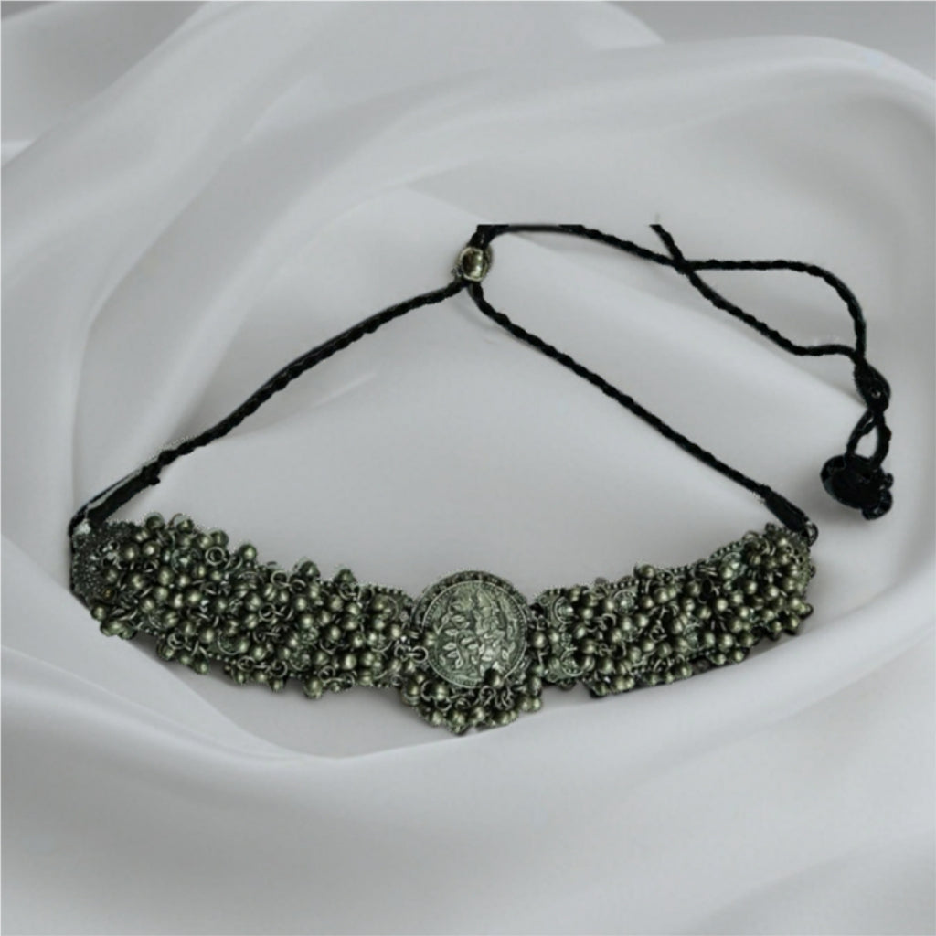 Elevate your ethnic look with the timeless charm of the Noor Ghungroo Oxidized Choker Set. Crafted in antique silver-tone metal, this statement choker features intricate traditional detailing adorned with clusters of ghungroo bells, symbolizing grace and heritage. The central engraved motif adds a regal touch, while the adjustable black thread tie ensures a comfortable fit.