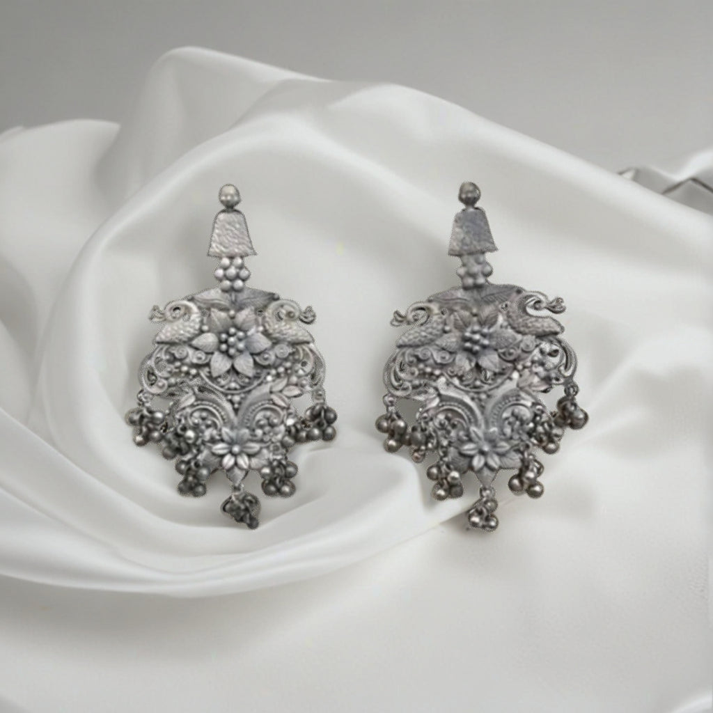 These oxidized silver-plated jhumka earrings are a must-have for anyone who loves statement jewelry. Featuring intricate filigree work and a beautiful dome-shaped jhumka design, they add a touch of traditional charm to any outfit.