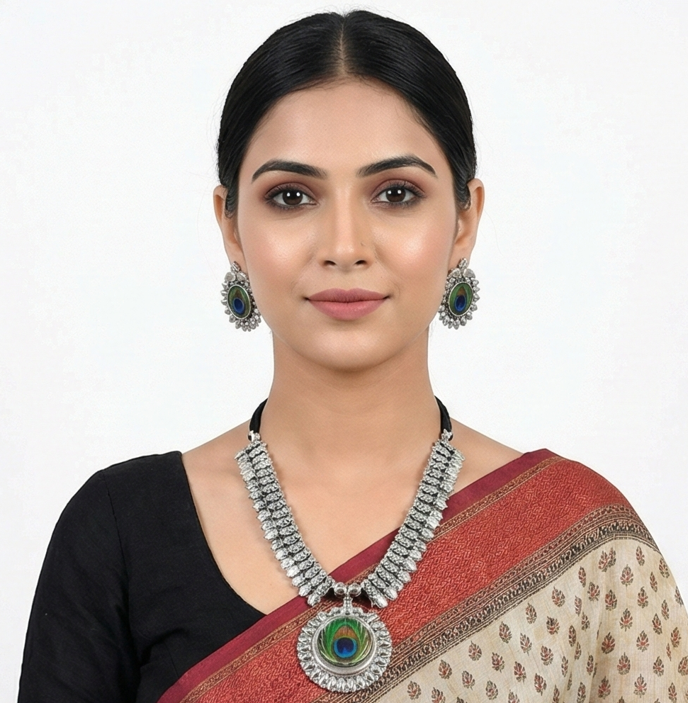Every piece is carefully checked for quality, symmetry, and shine before it reaches you. The oxidized silver finish is polished to enhance its traditional charm while keeping the artisanal handcrafted look intact. The smooth edges, clean detailing, and vibrant peacock artwork ensure that this jewellery set stands out beautifully in any ethnic ensemble.