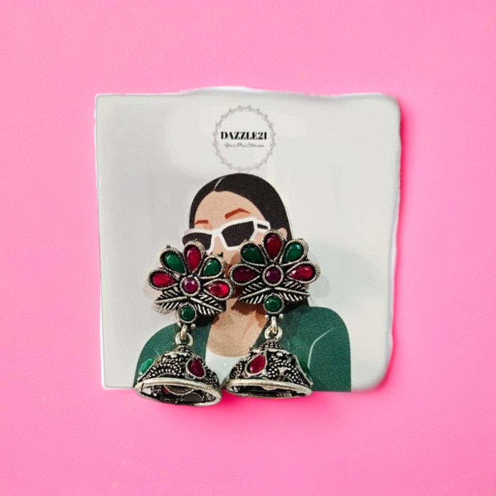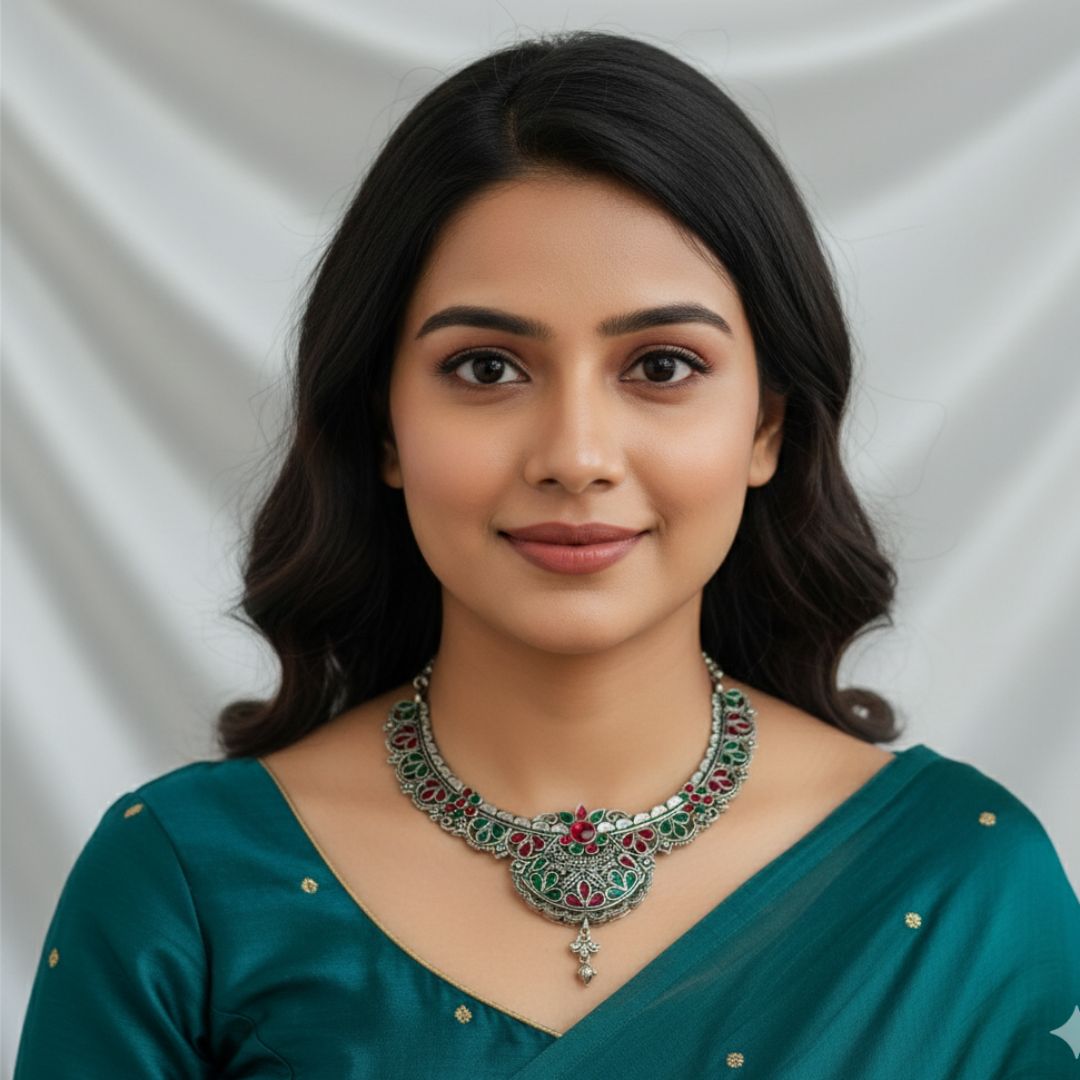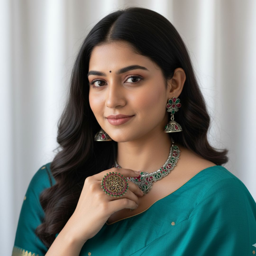 Elevate your ethnic elegance with this exquisitely crafted Rajwadi-inspired oxidized silver jewelry set, featuring a striking blend of emerald green and ruby red stones. The beautifully detailed necklace showcases traditional floral and paisley motifs with intricate enamel work, finished with a graceful central drop that adds regal charm.