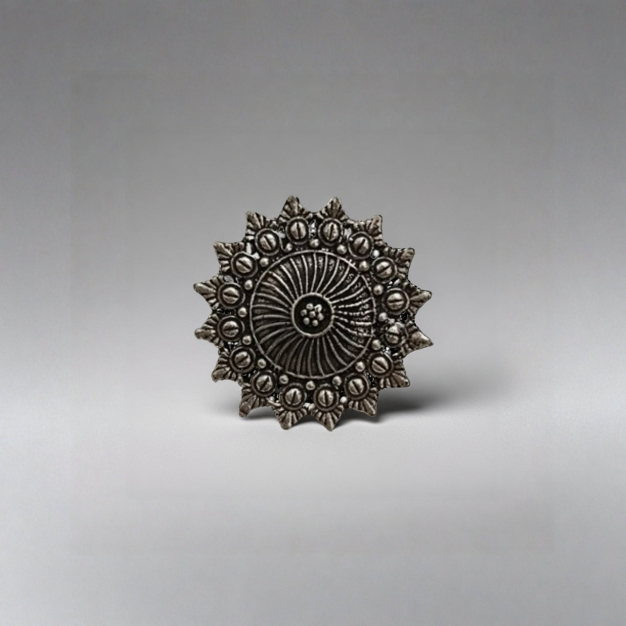 The Surajmukhi Heritage Statement Ring draws inspiration from the radiant beauty of the sun and traditional Indian metal artistry. Crafted in an oxidized silver finish, this striking circular ring features a detailed sunburst design with layered textures and sculpted accents that radiate outward from the center.