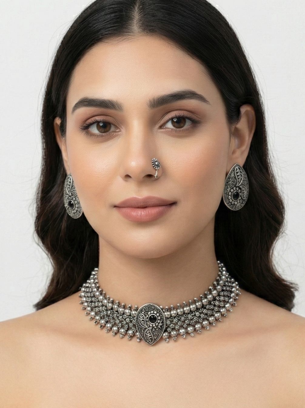 Elevate your ethnic elegance with this beautifully handcrafted oxidised silver jewellery set, designed to add a bold and artistic charm to any traditional or Indo-fusion look. This stunning collection features four statement pieces—a detailed oxidised choker necklace, intricately carved teardrop earrings, a bold oversized statement ring, and a delicately crafted oxidised nose pin.